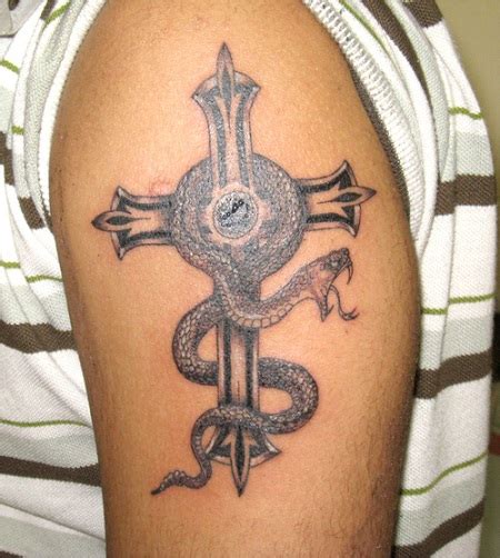 The cross symbolizes jesus and the snake is a symbol of satan. Tattoo on l_shoulder (skull and. Url to email and im this pic. The rod of asclepius is another symbol of medicine, yet it boasts only one snake entwined around a rod. This makes it a popular tattoo design for both men and women.